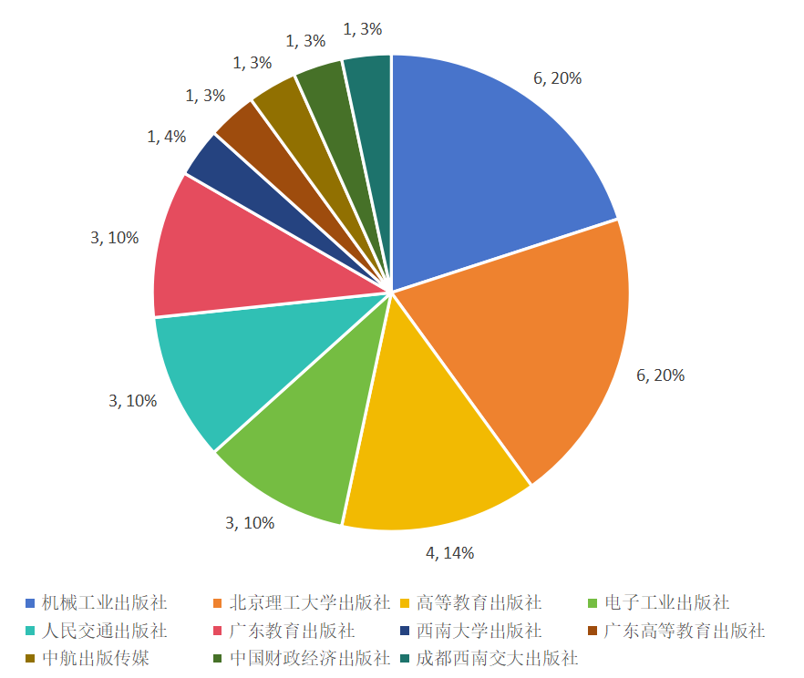 从出版机构看,机械工业出版社与北京理工大学出版社以各入选6种的成绩领跑,凸显了其在工科领域的优势,尤其是机械、车辆等方向的传统优势与深厚积淀。高等教育出版社(4种)、电子工业出版社(3种)、人民交通出版社(3种)等构成了第二梯队,分别从综合教育、电子信息与交通行业等角度提供了强力支撑。此外,榜单中还出现了中航出版传媒等跨界出版社的身影,这不仅反映了汽车产业与航空等高端制造技术的融合趋势,更标志着汽车类专业教材建设已突破传统范畴,形成了多方参与、资源共享的繁荣生态(详见图5)。